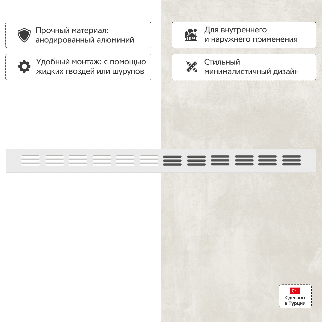 • Удобное крепление при помощи шурупов или жидких гвоздей