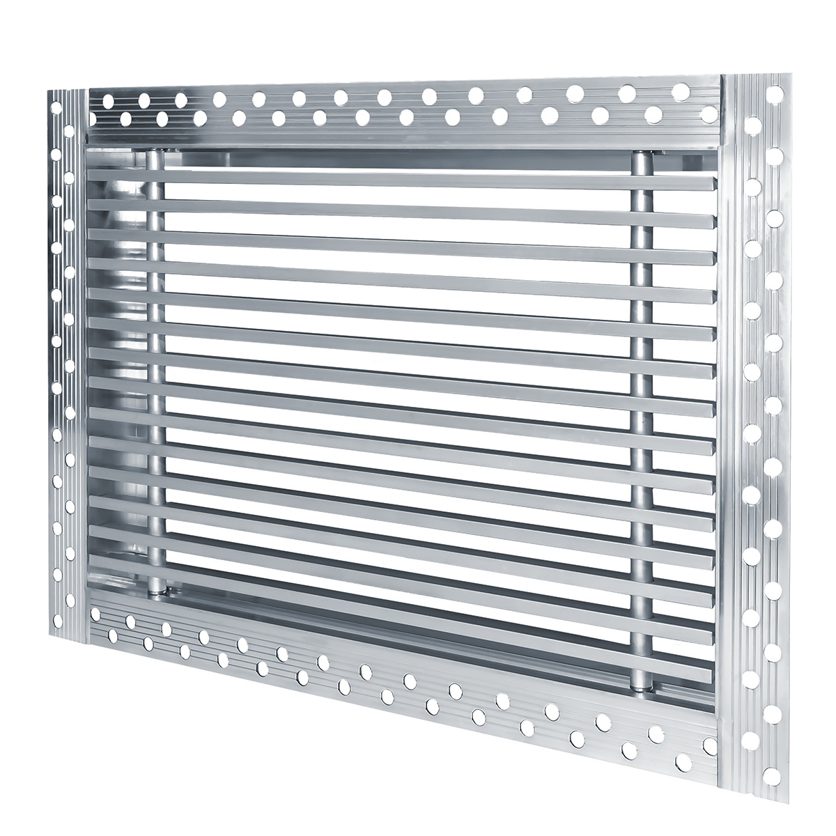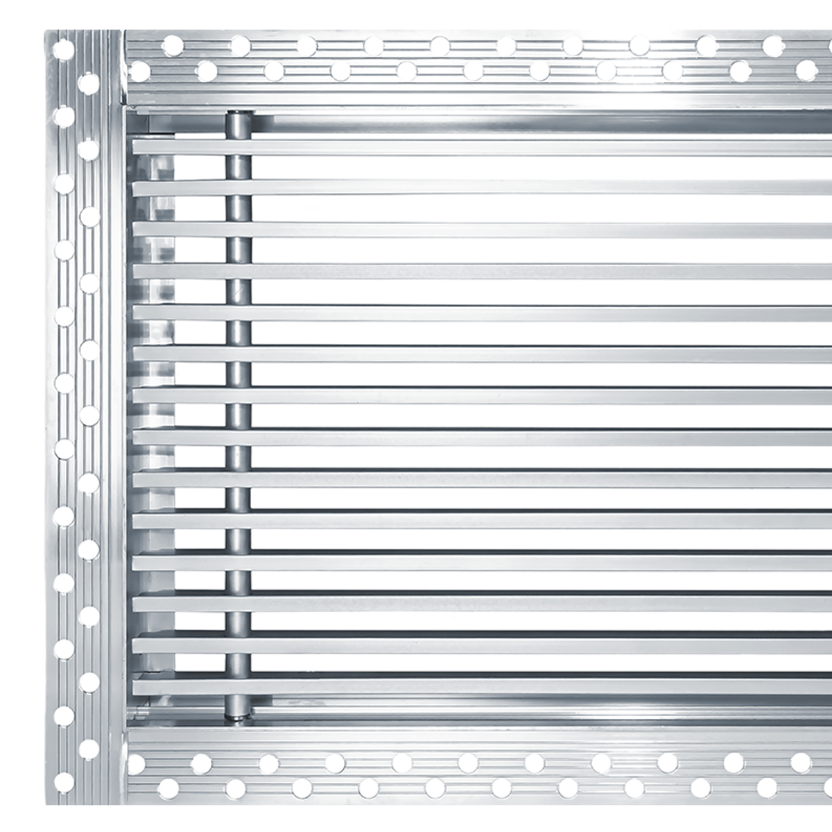 Данная решетка подходит для монтажа на любую поверхность под финишную отделку. Рамка и экран изготовлены из алюминия, опора экрана - из оцинкованной стали. Рама оснащена «полкой» 1,9 мм и рифлеными краями для большей адгезии финишного материала – шпатлевки, цемента. Решетка имеет съемную центральную часть с фиксированным углом наклона ламелей 0°. Она крепится к корпусу прочными металлическими тросиками, легко снимается для очистки и удобного обслуживания.