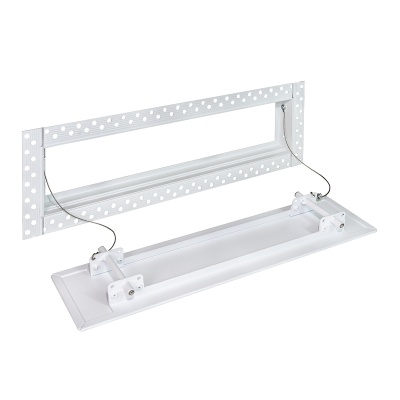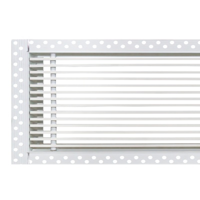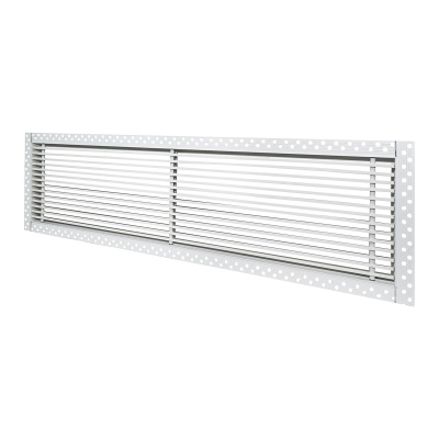 Данная решетка подходит для монтажа на любую поверхность под финишную отделку. Рамка и экран изготовлены из алюминия, опора экрана - из оцинкованной стали. Рама оснащена «полкой» 1,9 мм и рифлеными краями для большей адгезии финишного материала – шпатлевки, цемента. Решетка имеет съемную центральную часть с фиксированным углом наклона ламелей 0°. Она крепится к корпусу прочными металлическими тросиками, легко снимается для очистки и удобного обслуживания.